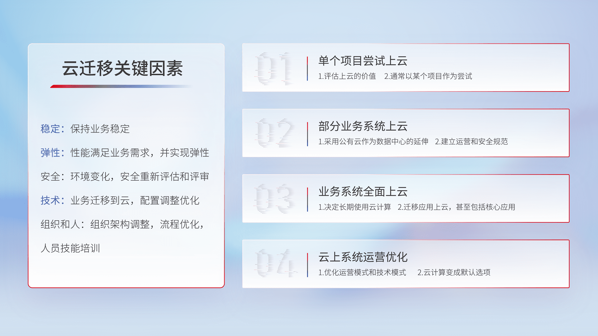 结合实际业务,,,,从规划设计、、云平台选型、、、、云原生改造、、数据迁移、、、、集成交付,,迁移全过程为客户识别最佳上云路径,,,做好风险识别管理,,,,设计网络架构、、、、身份权限、、安全审计合规、、、操作审计、、、、日志审计、、监控告警策略、、、多站点容灾设计等,,,对云上基础设施进行整体规划,,提升IT治理水平,,,,以满足弹性、、、、高可用、、、高性能的需求。。。
