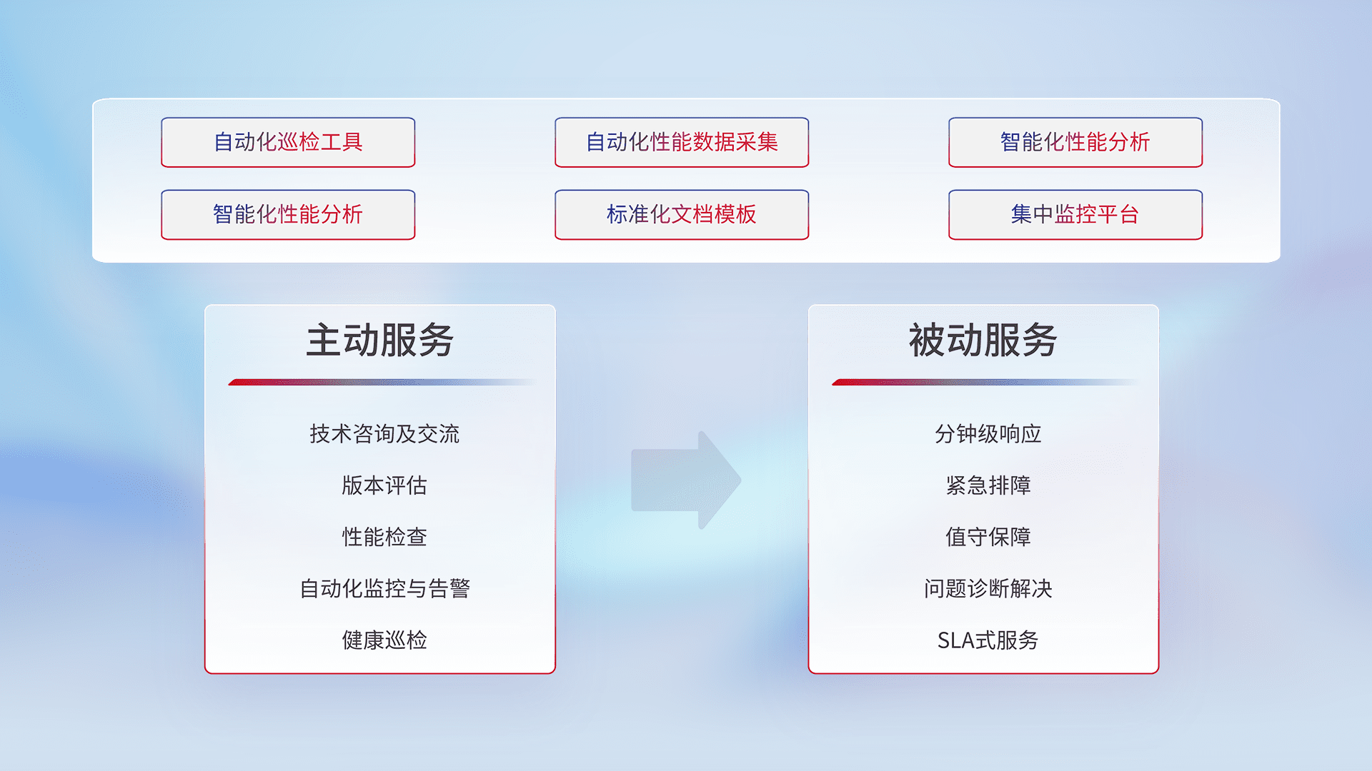 智能化工具和标准化文档,,保障服务质量,,,,提供主动服务(包含技术咨询、、版本评估、、、性能检查、、、、自动化监控与告警、、、健康巡检)和被动服务包含(分钟级响应、、、、紧急排障、、、、值守保障、、、问题诊断解决、、、、SLA服务)。。